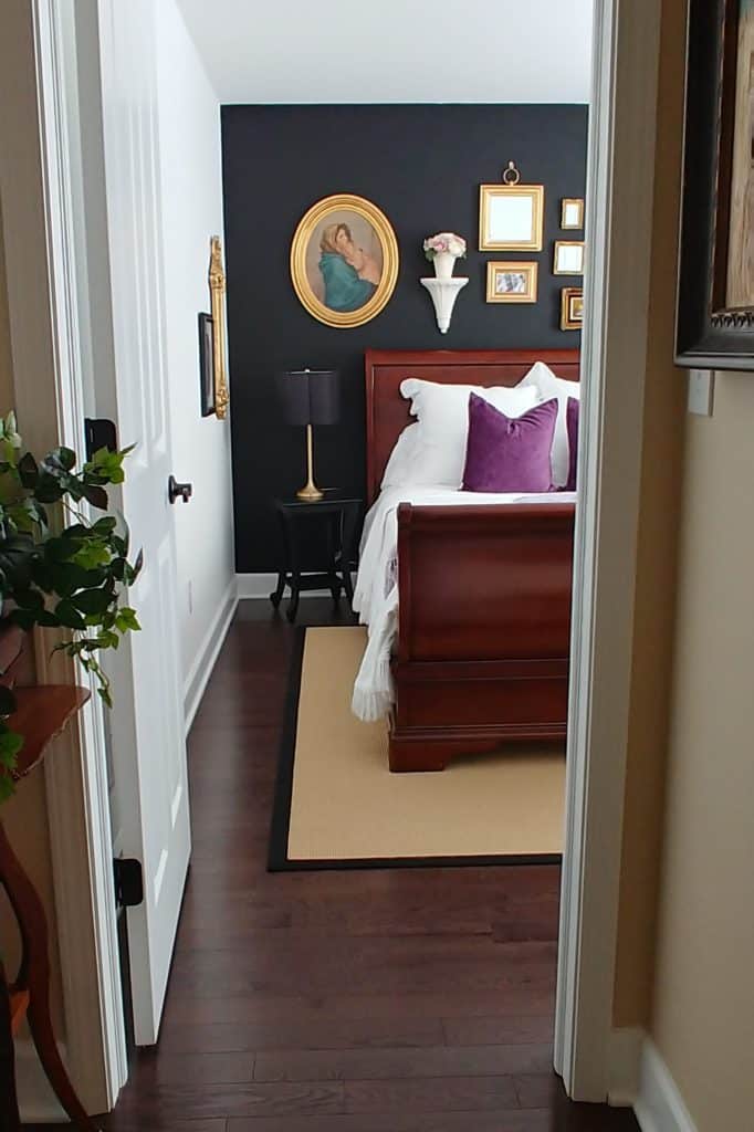 - Lastly, before painting take a moment to plan out what you will pair with your black accent wall in terms of decorative elements. Black wall paint pairs best with warm tones of wood, ivory, and rich textures.