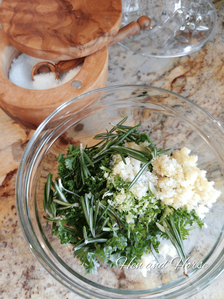 - In a small bowl combine parsley, rosemary, lime peel and juice, and garlic. Set aside.